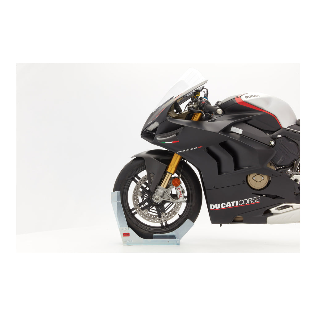 The SteadyStand Fixed can easily be mounted onto the floor of a trailer or van. You can ride your motorbike into the SteadyStand Fixed to make it stand in an upright position. The weight keeps the motorcycle firmly anchored. The only thing left is to put straps onto the motorcycle for total security. The SteadyStand Fixed is adjustable for different wheel sizes, suitable for 10 to 19-inch tyres with a tyre width of 90 mm up to 130 mm.