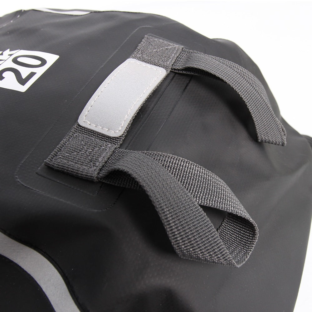 Totally waterproof Backpack. Carry your Valuables anywhere with confidence knowing they will always be dry and dust free with this innovative travel backpack. This bag is manufactured from Heavy Duty 500D 3 layer Vinyl/ polyester Material for maximum strength, all seams are carefully heat bonded to ensure total water resistance as are the extra reinforcing panels at all strap mounting points and pockets etc. Other features include: - 20 Litres storage capacity - Roll top opening to prevent water entry - Outer quick access pocket - Adjustable shock chords to secure any external Items - Cushioned / Vented back support panels for riding comfort - Rubberised carry handle - Night safety reflective stripes