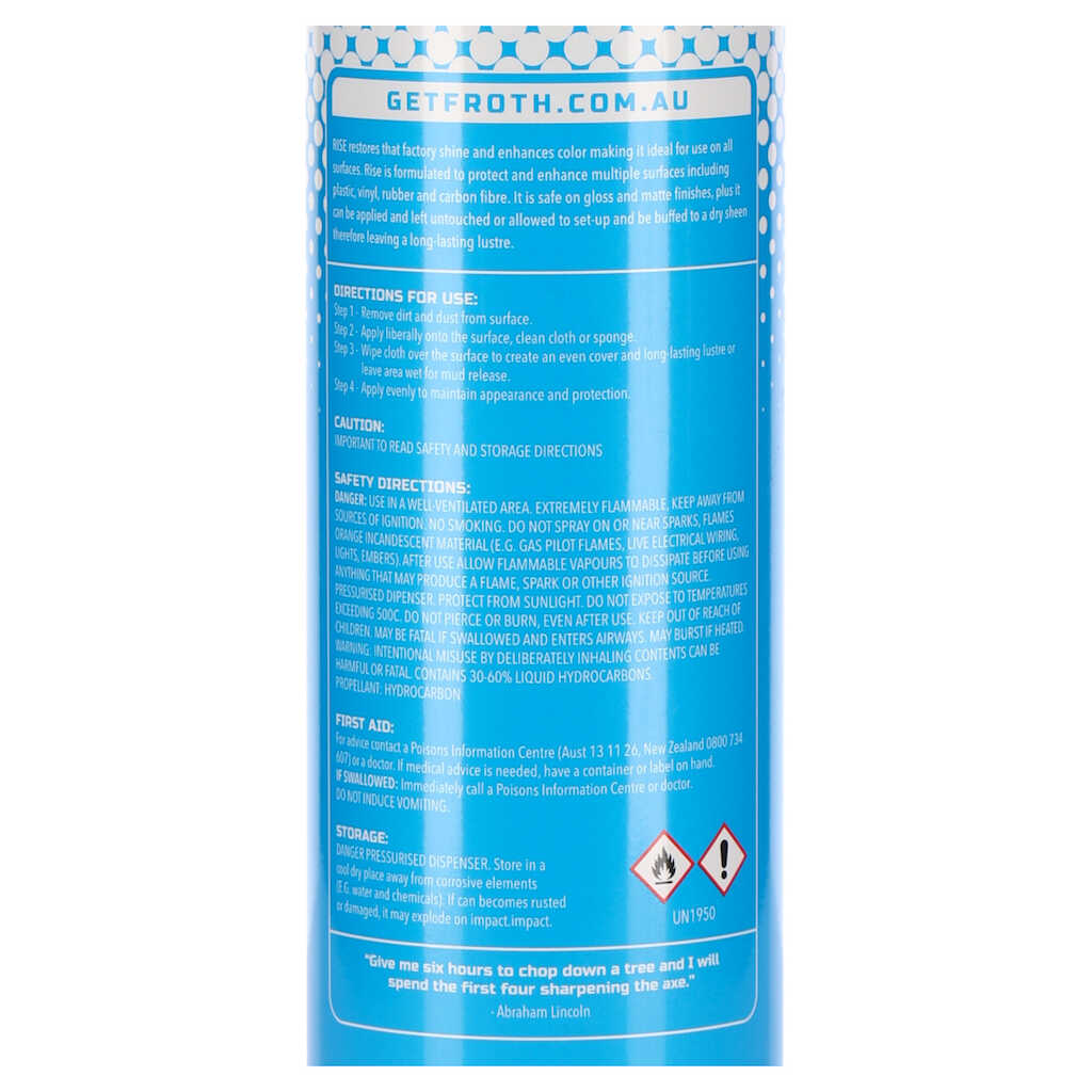 RISE restores that factory shine and enhances color making it ideal for use on all surfaces. Rise is formulated to protect and enhance multiple surfaces including plastic, vinyl, rubber and carbon fibre. It is safe on gloss and matte finishes, plus it can be applied and left untouched or allowed to set-up and be buffed to a dry sheen therefore leaving a long-lasting lustre.