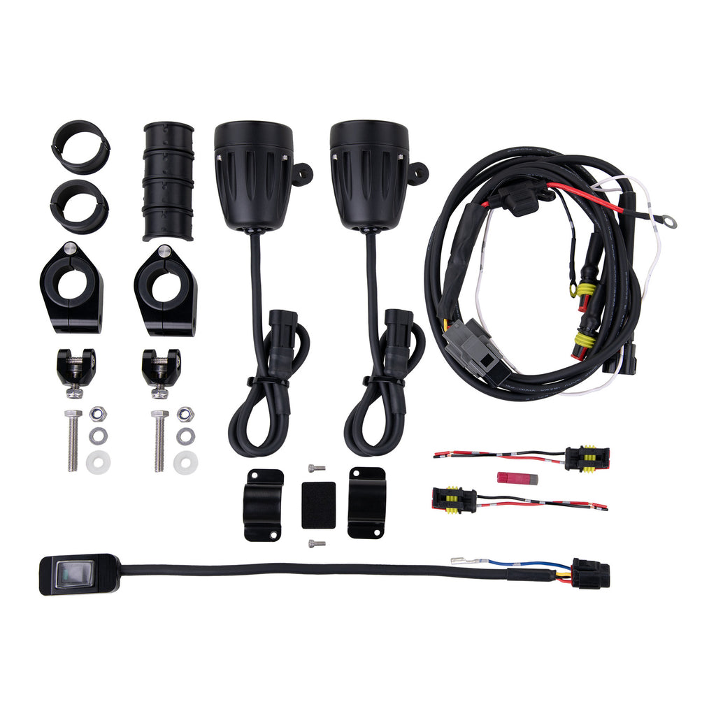 Oxford's Auxiliary Lights are a great aesthetic for adventure-style bikes. The kit comes with adjustable mounting brackets (suitable for bars from 22-28mm in diameter), a waterproof handlebar switch and a trigger wire for splicing into the motorcycle's flasher switch if this functionality is required.