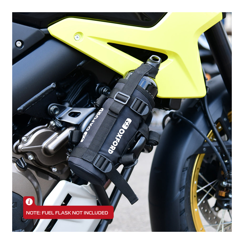 Adjustable drinks and fuel bottle carrier designed to fit Oxford Fuel flask 1.5L and 1.0L and the Oxford Insulated Drinks Bottle 1.0L.